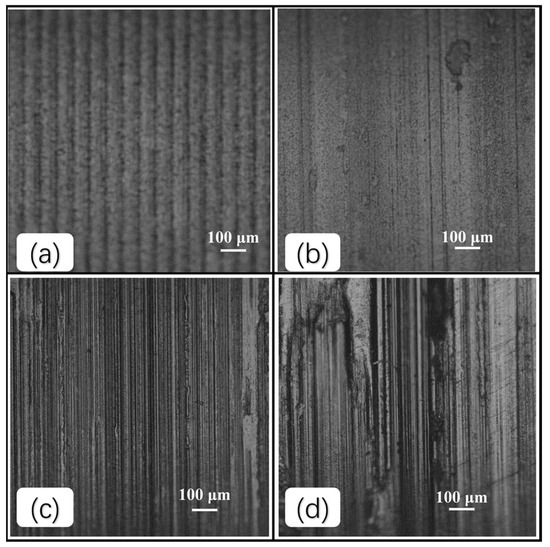 (a) The optical microscope image of the bushing surface before the experiment; (b) The optical microscope image of the bushing surface at 250 °C; (c) The optical microscope image of the bushing surface at 300 °C; (d) The optical microscope image of the bushing surface at 350 °C.
