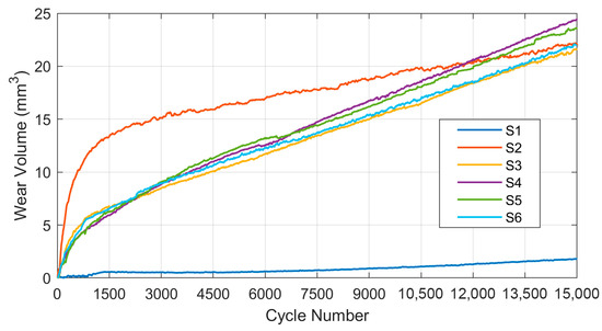 Under identical temperature and load conditions, the equivalent wear volume curves of Samples 3–6, repeated four times, show excellent consistency, indicating that the test apparatus operates stably, and the wear volume data has good repeatability. The wear volumes per 1000 cycles for Samples 3–6 in the steady wear stage are 0.581 mm3, 0.54 mm3, 0.504 mm3, and 0.569 mm3, respectively. The average wear volume of the four samples is 0.5485 mm3, with a standard deviation of 0.0297 mm3 and a coefficient of variation of 5.42%. These results indicate low dispersion and good repeatability. The consistent wear volume trends across different specimens further confirm the stability and precision of the experimental setup.