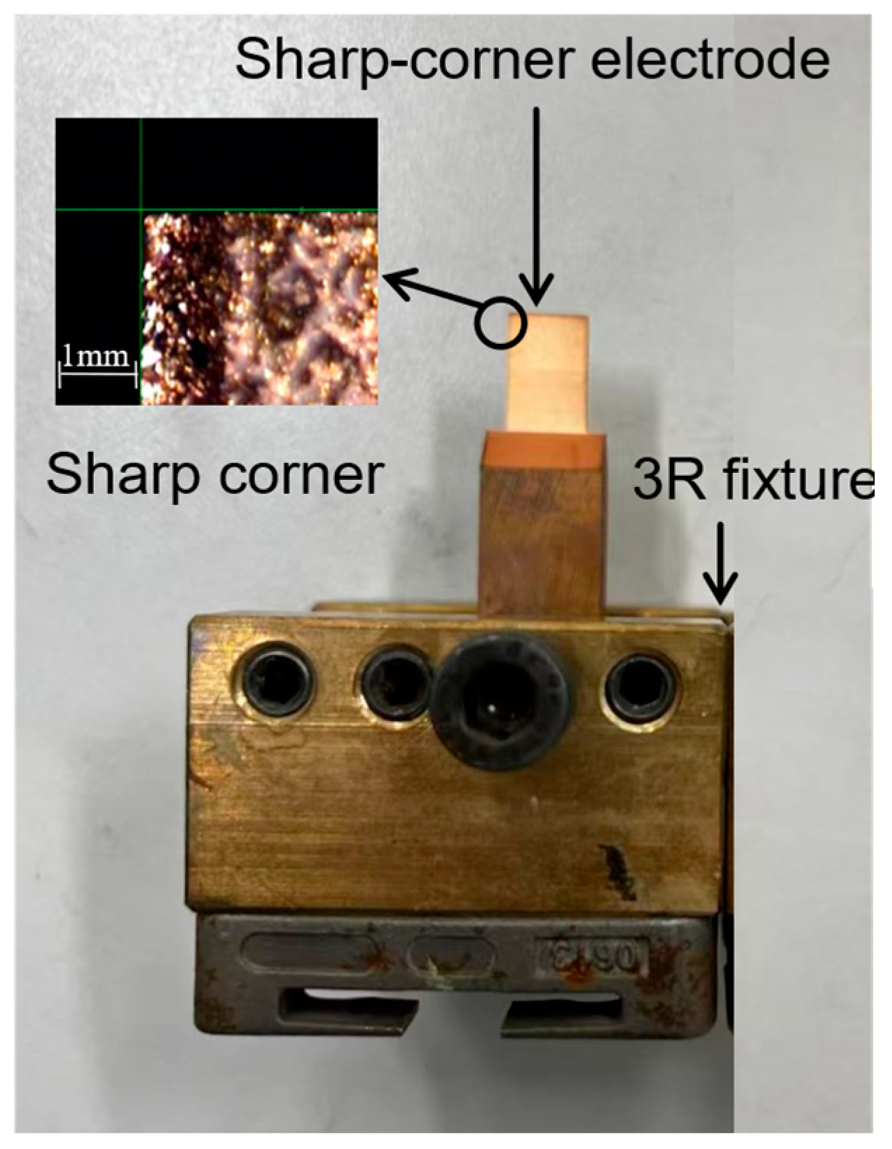 - Pellegrini, G.; Ravasio, C. Investigation on electrode wear in micro-EDM drilling. MM Sci. J. 2024. [Google Scholar] [CrossRef]