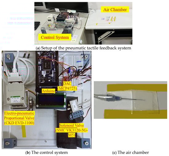 In this study, a pneumatic tactile feedback system (Figure 1) was developed. The system employs compressed air supplied by an air compressor, with airflow dynamically regulated through an SMC VK3120-5G-M5 solenoid valve and a CKD EVD-1100 electro-pneumatic proportional valve. The solenoid valve, controlled by an Arduino, enables rapid switching of airflow, while an MCP4725 digital-to-analog converter (DAC) provides the control voltage for continuous pneumatic pressure modulation via the electro-pneumatic proportional valve. The regulated compressed air is delivered to a silicone air chamber (3 mm × 3 mm × 3 mm, approximately 27 mm3), which undergoes inflation and deflation to generate perceivable tactile stimuli. The system operates at a maximum frequency of 10 Hz, and the air chamber can be inflated up to approximately 100 kPa.