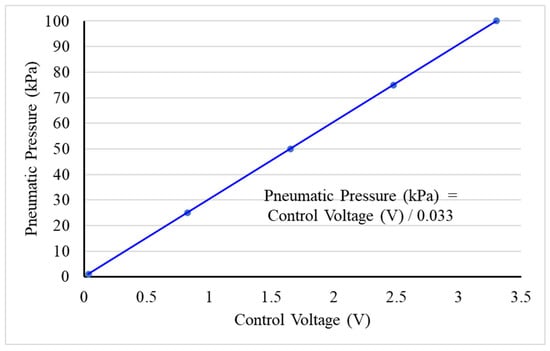 To characterize the relationship between the control voltage and the resulting pneumatic pressure, a series of calibration experiments were conducted. The Arduino program was configured to output a PWM signal, which was gradually increased from 0 to 255 in fixed increments of 15. At each step, the corresponding output voltage was measured using a digital multimeter, while the pneumatic pressure regulated by the electro-pneumatic proportional valve was simultaneously recorded. The results is shown in Figure 2. The collected data pairs of voltage and pneumatic pressure were then analyzed, yielding an approximate linear relationship between the control voltage and the resulting pneumatic pressure, as shown in Equation (2).