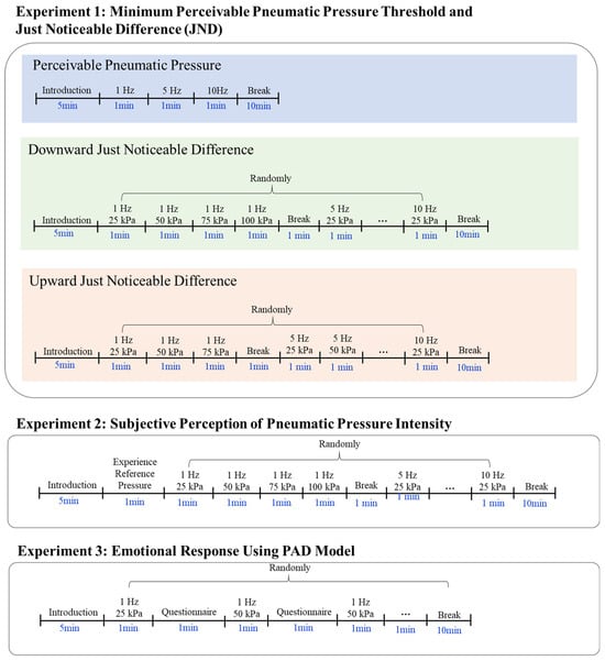 Each participant completed the three experiments to investigate different aspects of pneumatic tactile perception. The experimental procedure is shown in Figure 3. All experiments were conducted with participants seated at a desk, with their index finger resting on the silicone air chamber in a natural and relaxed state. Ambient temperature in the laboratory was controlled by maintaining air conditioning at 24 °C throughout the experiment. Ten-minute breaks were provided between each experimental session to prevent fatigue, and participants were allowed to terminate their participation at any time if they experienced discomfort, ensuring their well-being and safety.
