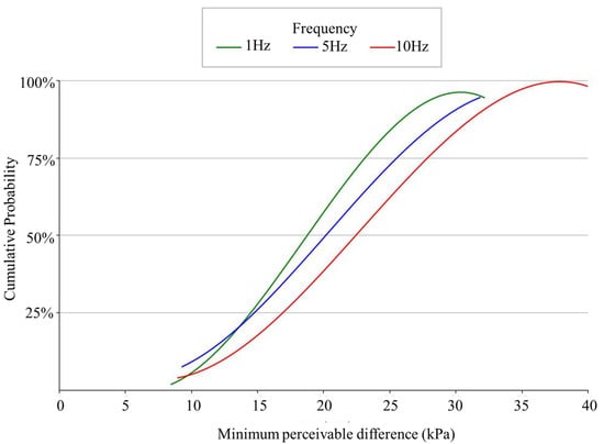 This method allowed for a robust estimation of the perceptual sensitivity range by incorporating both the lower and upper quartiles of the participants’ response distributions [27]. The cumulative distribution functions (CDFs) of JND measurements were calculated for each reference pressure at every testing frequency. Figure 4 illustrates an example of the cumulative distribution of the minimum perceivable differences obtained at a reference pneumatic pressure of 75 kPa under three vibration frequencies (1 Hz, 5 Hz, and 10 Hz). The S-shaped curves clearly demonstrate the distribution of perceptual thresholds across participants. The horizontal gray lines at the 25% and 75% cumulative probabilities mark the range used to compute the JND, corresponding to the lower and upper quartiles of perceptual responses.