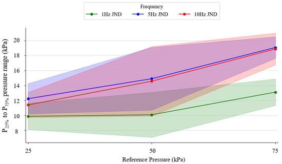 The upward JNDs represent the minimum detectable increases from reference pneumatic pressures (25, 50, 75 kPa). The upward JND results across testing frequencies are presented in Table 7. Figure 6 presents the upward JND values plotted against the reference pneumatic pressure at 1 Hz, 5 Hz, and 10 Hz. The solid lines represent the JND trends for each frequency condition. The semi-transparent shaded regions around each curve correspond to the IQR between the 25th and 75th percentiles.