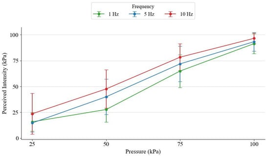 Table 11 and Figure 7 show the relationship between perceived pneumatic pressure intensity and the reference pneumatic pressures. A repeated-measures ANOVA was conducted to examine the effects of pneumatic pressure and stimulation frequency on the subjective perception of tactile intensity (Table 12). The results revealed a significant main effect of pneumatic pressure (p-value < 0.001), indicating that as the pressure increased, the simulated haptic feedback became more perceivable.