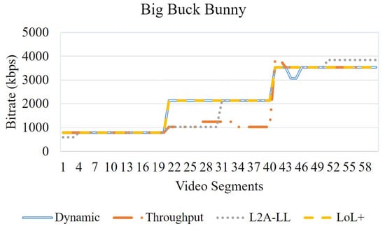 In this section, the objective evaluation is presented. The detailed analysis is published [12]. In Figure 3, shows the network profile used for the experiments. The streaming session began at a bandwidth of 1 Mbps, which was subsequently increased to 2 Mbps and then to 4 Mbps. The video sequences consist of 2-s segments. Figure 4 depicts the variations in bitrates for algorithms for the video Big Buck Bunny. Among all algorithms, LOL+ and the dynamic increases the bitrate when the bandwidth increases from 1 Mbps to 4 Mbps. However, the L2A-LL and Throughput algorithms delay increasing the bitrate to minimize the risk of interruption. Figure 5, Figure 6 and Figure 7 demonstrate that the dynamic algorithm performs consistently across all videos. In Figure 8, all algorithms are compared. The dynamic algorithm achieves the maximum video rates in all streaming sessions regardless of video sequences. The LOL+ reacts abruptly to the network variations while streaming Big Buck Bunny and Elephant. During the streaming of Tears of Steel and Spark, it increased bitrate initially but quickly reduced to prevent playback interruptions. The Throughput algorithm carefully increases the bitrate for Big Buck Bunny and Elephant but more aggressively improves the video quality when streaming Tears of Steel and Spark. A comparison is shown in Figure 8, demonstrating that traditional DASH algorithms yield higher bitrates streaming Tears of Steel and Spark compared to BBB and Elephant. However, low-latency algorithms LOL+ and L2A-LL algorithms achieved the similar average bitrates in all streaming sessions. Figure 9 depicts the number of bitrate switches; the LoL+ algorithm experiences the lowest number of video rate switches followed by traditional DASH algorithms. On the other hand, the L2A-LL algorithm had the highest number of bitrate switches. As illustrated in Figure 4, Figure 5, Figure 6 and Figure 7, most of these changes were minor and probably would not be noticed by the user. The significant bitrate changes occurred when the available bandwidth prompted the algorithms to raise the bitrate. Overall, both Dynamic and LOL+ maintained high video quality across all streaming sessions while ensuring minimal and stable bitrate fluctuations. The Figure 4, Figure 5, Figure 6, Figure 7, Figure 8 and Figure 9, taken from the objective evaluation part and already published in [12].