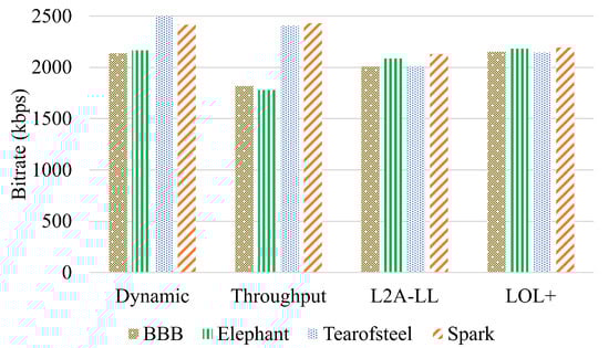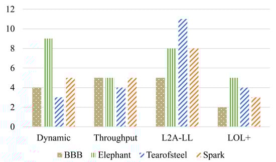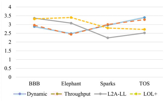 Figure 13 shows the MOS scores for the algorithms evaluated across four video sequences (Big Buck Bunny (BBB), Elephant, Sparks, and Tears of Steel (TOS). Figure depicts that the Dynamic and Throughput algorithms demonstrate comparable performance, maintaining moderate perceptual quality across all videos, with slightly improved ratings for TOS. L2A-LL exhibits the lowest MOS values, particularly for Sparks, indicating instability in quality adaptation and reduced robustness under fluctuating conditions. In contrast, LOL+ consistently achieves the highest MOS scores, especially for BBB and Elephant, suggesting its effectiveness in sustaining high visual quality while minimizing playback degradation.