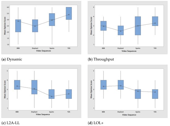Figure 14, presents the MOS distributions for four ABR algorithms—Dynamic, Throughput, L2A-LL, and LOL+. The box plots provide insights into both the central tendency and the variability of user ratings. The Dynamic and Throughput algorithms exhibit relatively narrow interquartile ranges with consistent median MOS values around three. This indicates a stable performance and limited perceptual fluctuation across different video contents. In contrast, the L2A-LL algorithm demonstrates a larger spread of scores, particularly for Sparks and TOS. This suggests a higher inconsistency in perceived quality. This variability can be attributed to its latency-oriented adaptation strategy, which may result in more frequent bitrate changes and visual fluctuations.