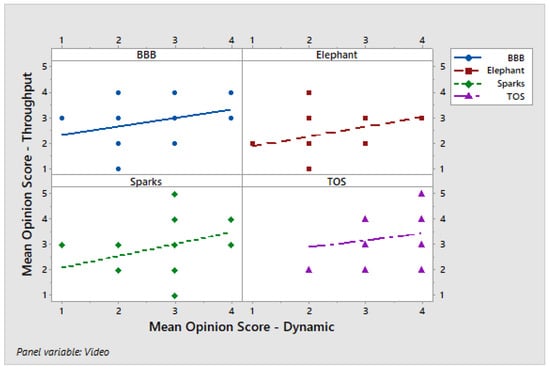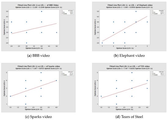 Next, the Spark video sequence was presented to users for subjective rating. Figure 17c illustrates reveals a clear trend line that indicates a moderate to strong positive correlation. The corresponding analysis of variance is summarized in Table 10. Based on the regression analysis, the following regression Equation (3) was derived: