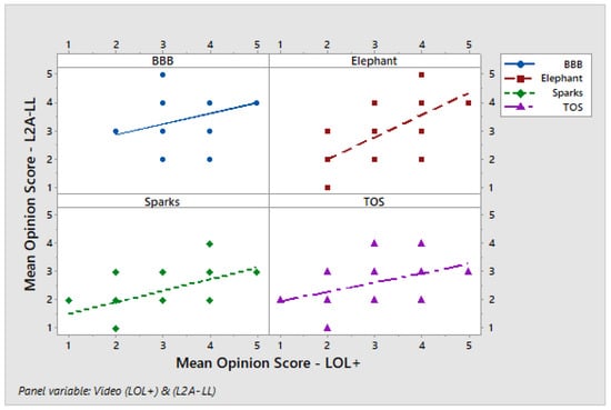 To further assess the relationship between two low-latency algorithms, a linear regression analysis was conducted comparing opinion scores from L2A-LL and LOL+ for all videos.