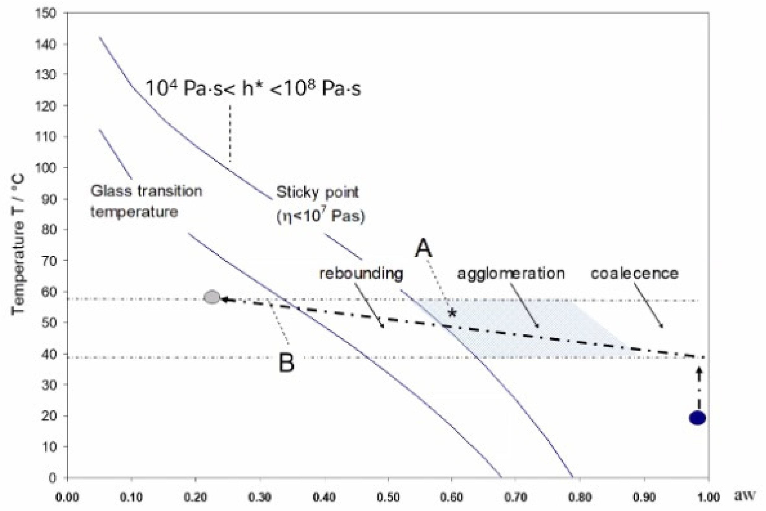 - Jaya, S.; Das, H. Glass transition and sticky point temperatures and stability/mobility diagram of fruit powders. Food Bioprocess Technol. 2009, 2, 89–95. [Google Scholar] [CrossRef]
