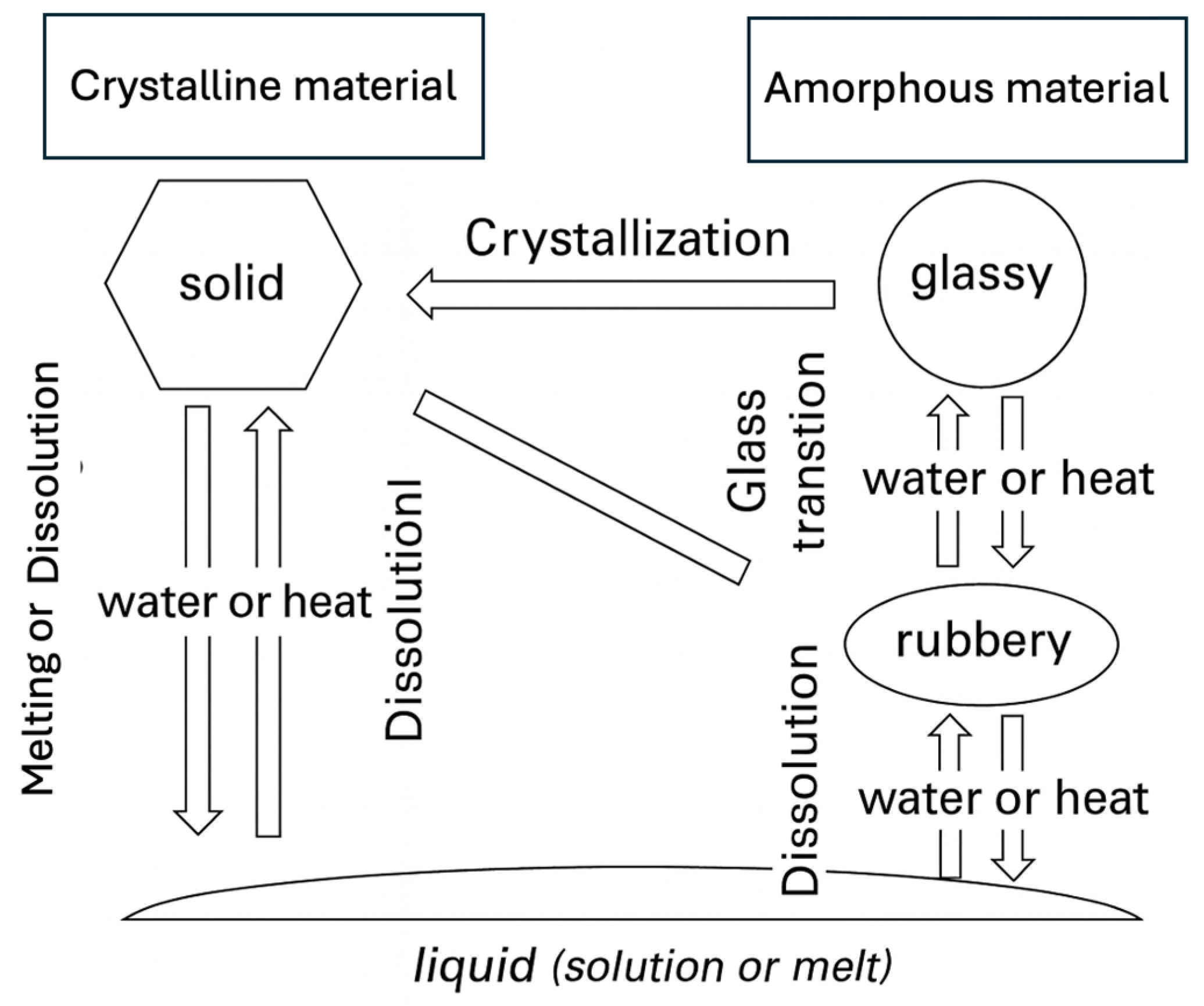 - Roos, Y.; Karel, M. Phase Transitions of Mixtures of Amorphous Polysaccharides and Sugars. Biotechnol. Prog. 1991, 7, 49–53. [Google Scholar] [CrossRef]