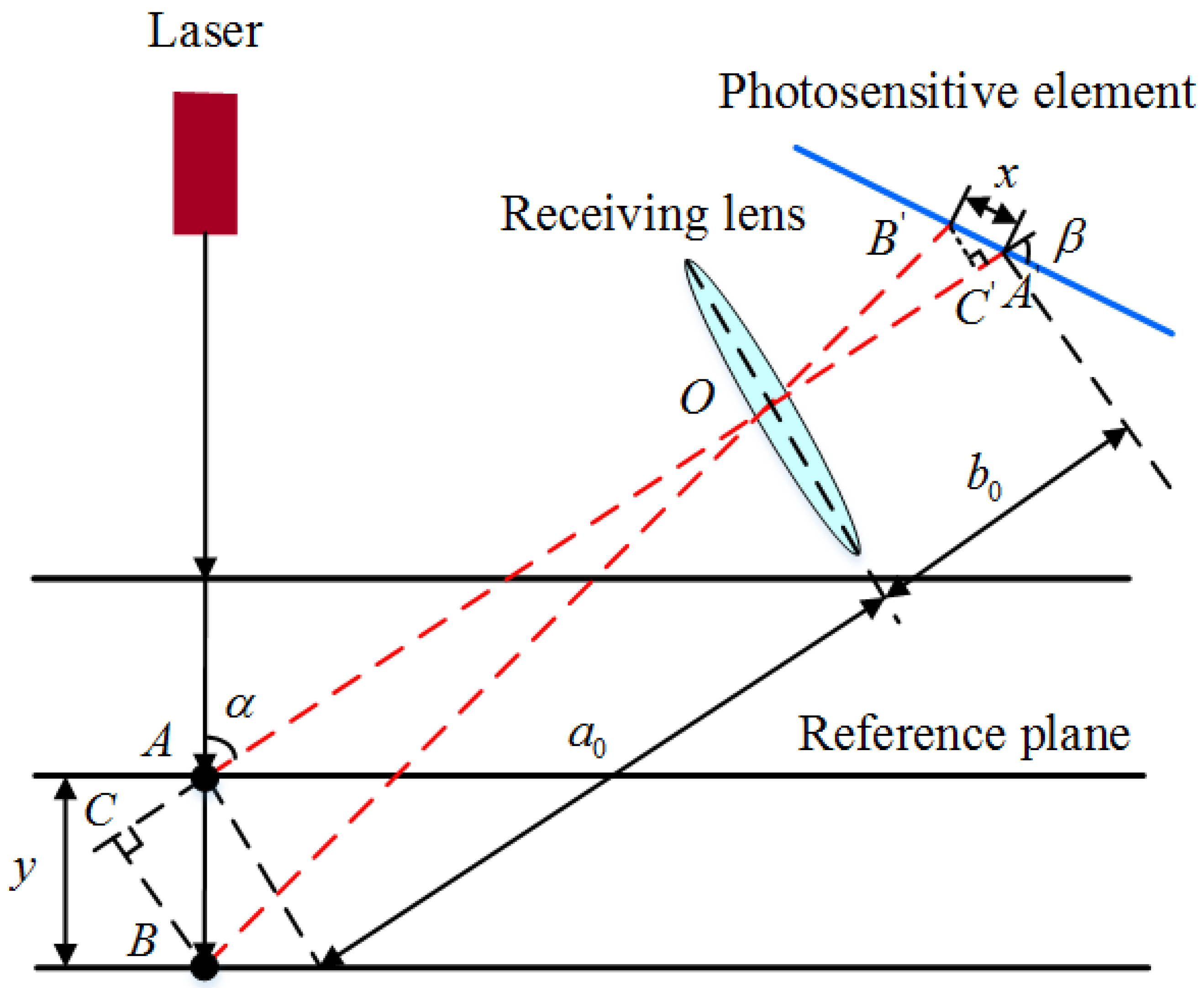 By comparing Formula (2) with Formula (1), the object image displacement formulas of the direct laser triangulation method and the oblique laser triangulation method only differ by the term. When , the two formulas are identical, meaning that direct laser triangulation method is a special case of the oblique laser triangulation method.