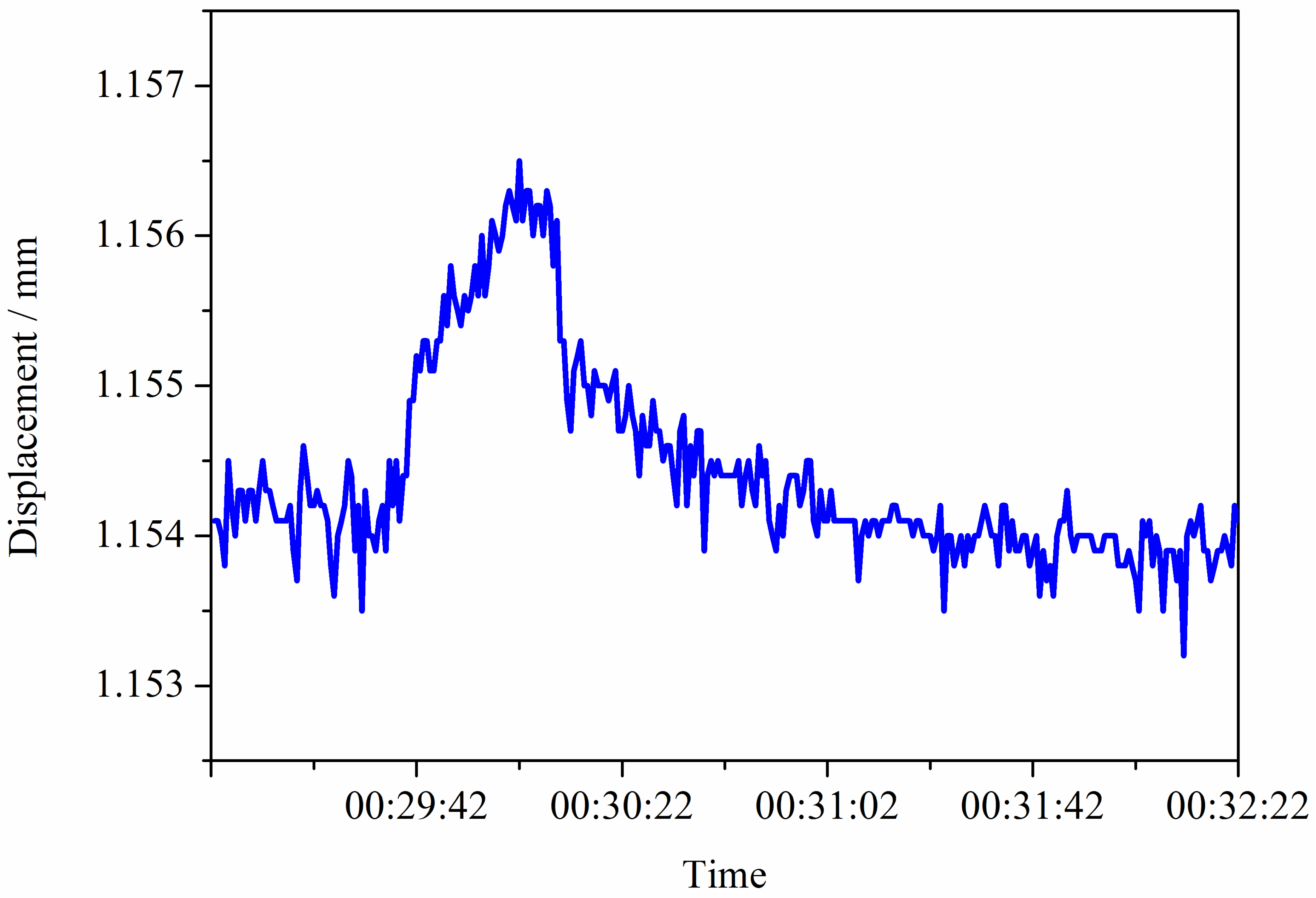 Figure 5, the initial displacement of the sensor was approximately 1.154 mm. After exposure to the hot air from the hairdryer, its displacement increased to over 1.156 mm. After ceasing the airflow, the displacement value of the sensor returned to approximately 1.154 mm. This indicates that the laser displacement sensor exhibits a pronounced temperature drift phenomenon, with environmental temperature variations exerting a significant influence on measurement results. Therefore, to avoid measurement errors caused by temperature variations, it is necessary to control the ambient temperature of the sensor to keep it always within the specified operating temperature range. Concurrently, compensate for its temperature drift. Typically, the parameter specifications for a laser displacement sensor will indicate its temperature drift characteristics. For sensors without specified temperature drift characteristics, their temperature drift parameters must be experimentally determined prior to use.