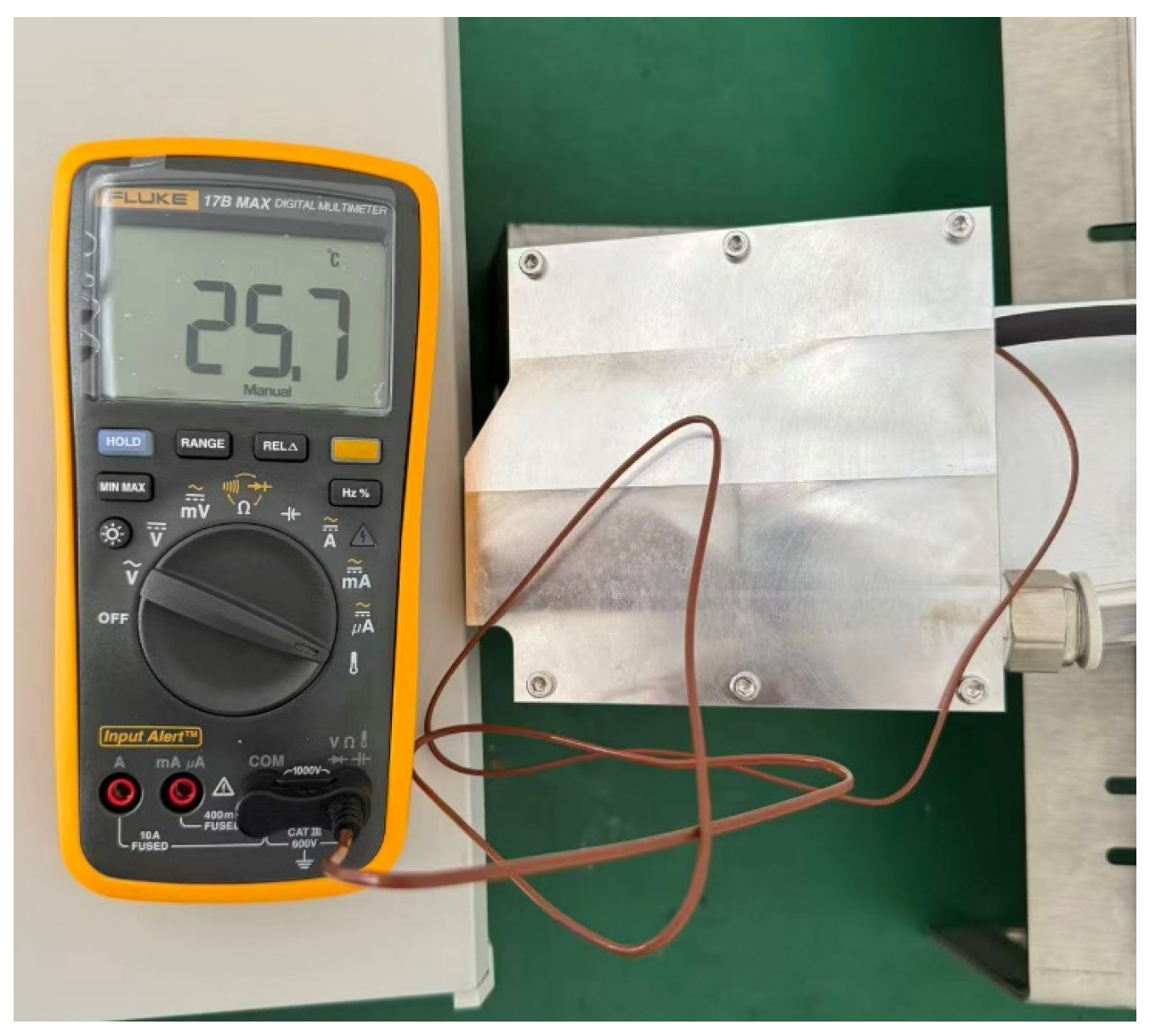 When a thermocouple was used to measure the temperature around the sensor without a protective housing, it was 43.1–45.4 °C. After the protective housing was adopted, the temperature inside the protective housing was 25.6–25.8 °C. The measurement process is shown in