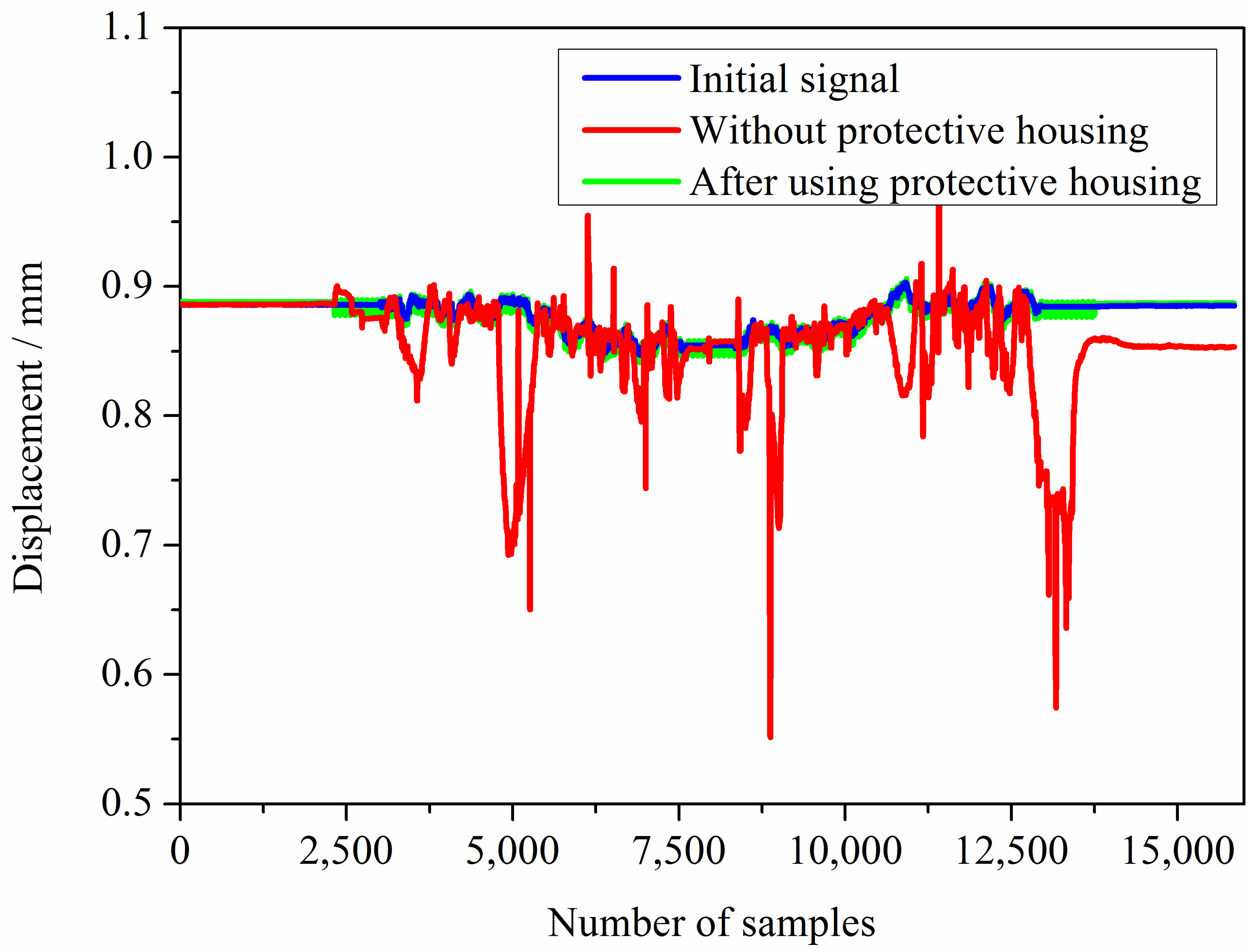 Figure 9, when water mist was sprayed between the sensor and the object being measured under test without the protective housing, the sensor’s output signal becomes chaotic, exhibiting significant error compared to the initial measurement data obtained without interference. The difference between the measured value after adopting the protective housing and the initial data was less than 5 μm, resulting in a significant improvement in measurement accuracy.