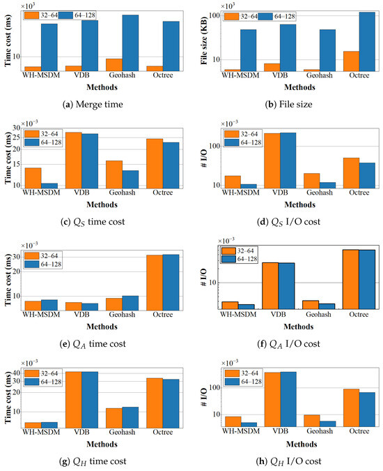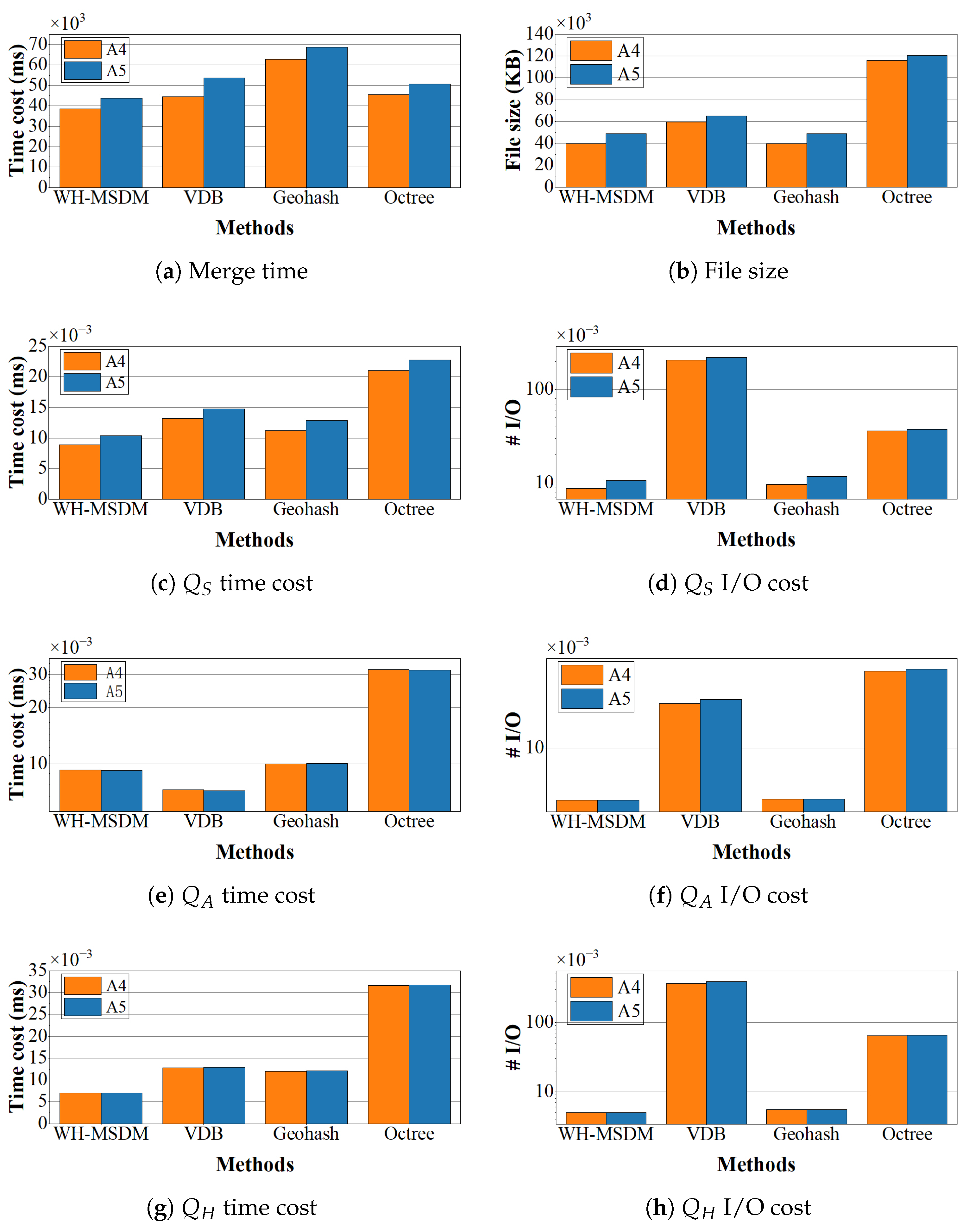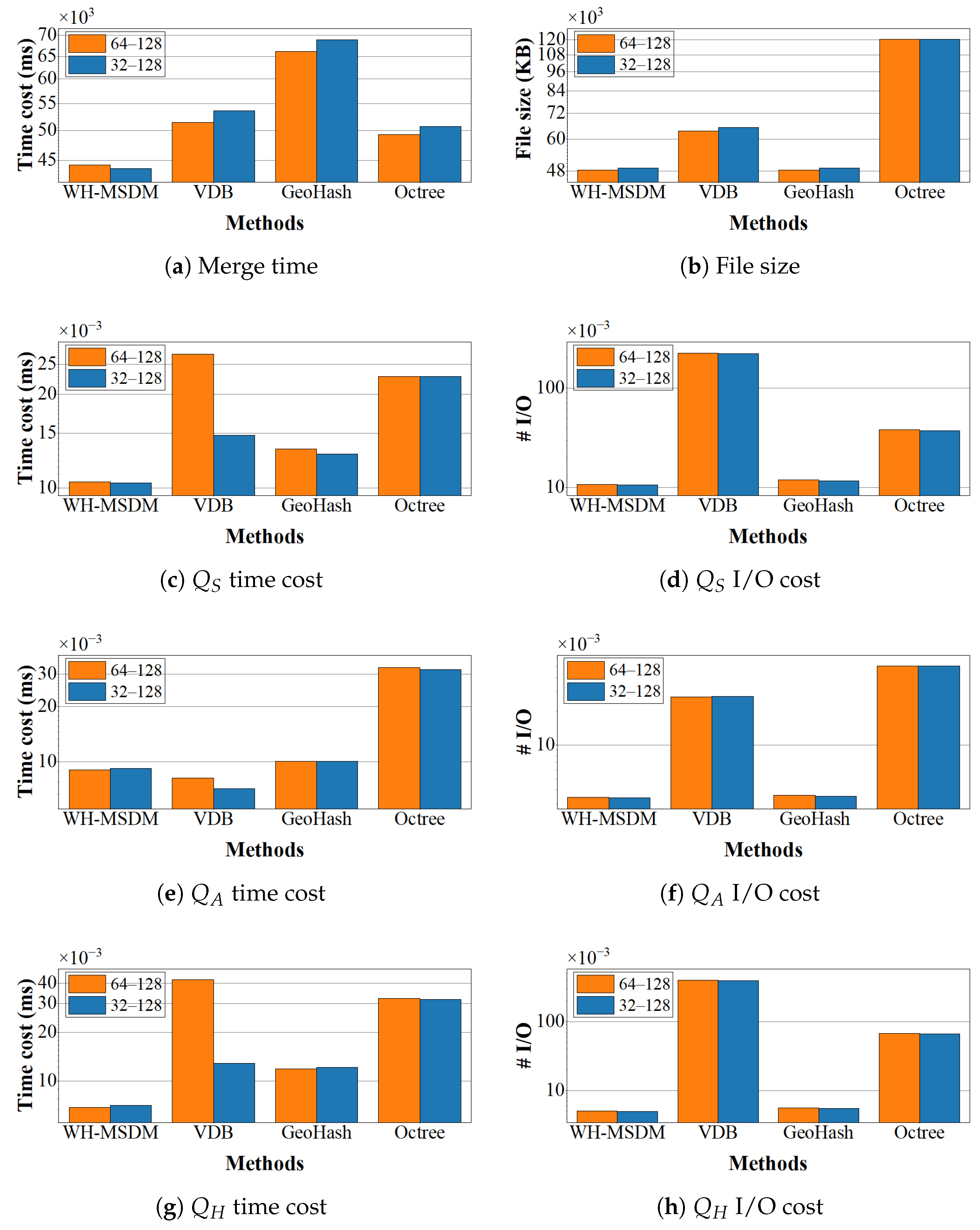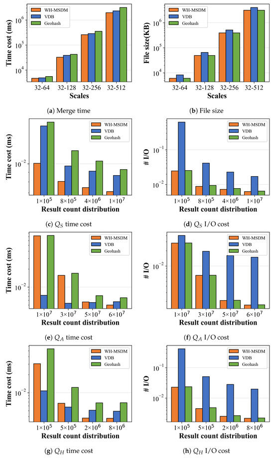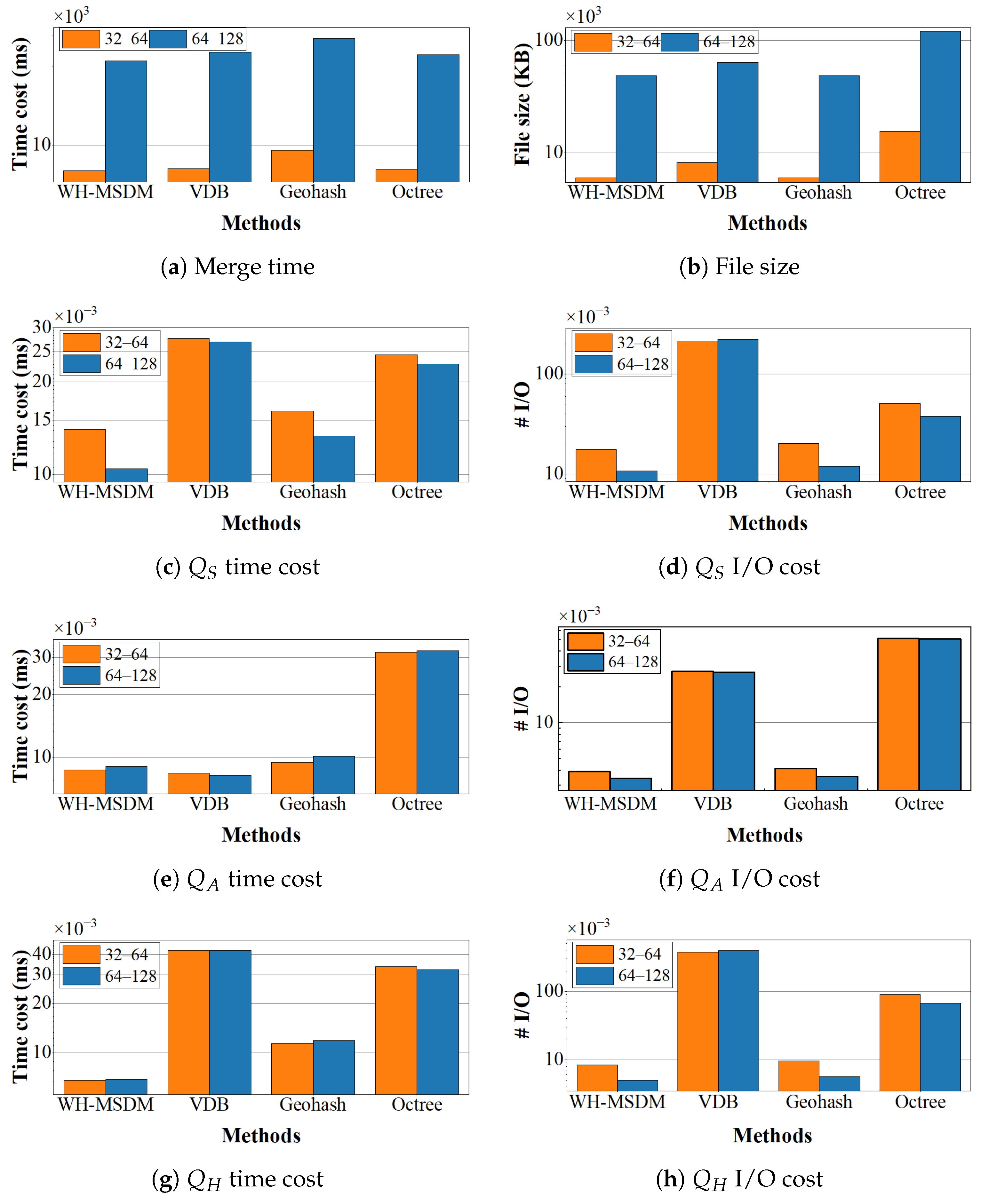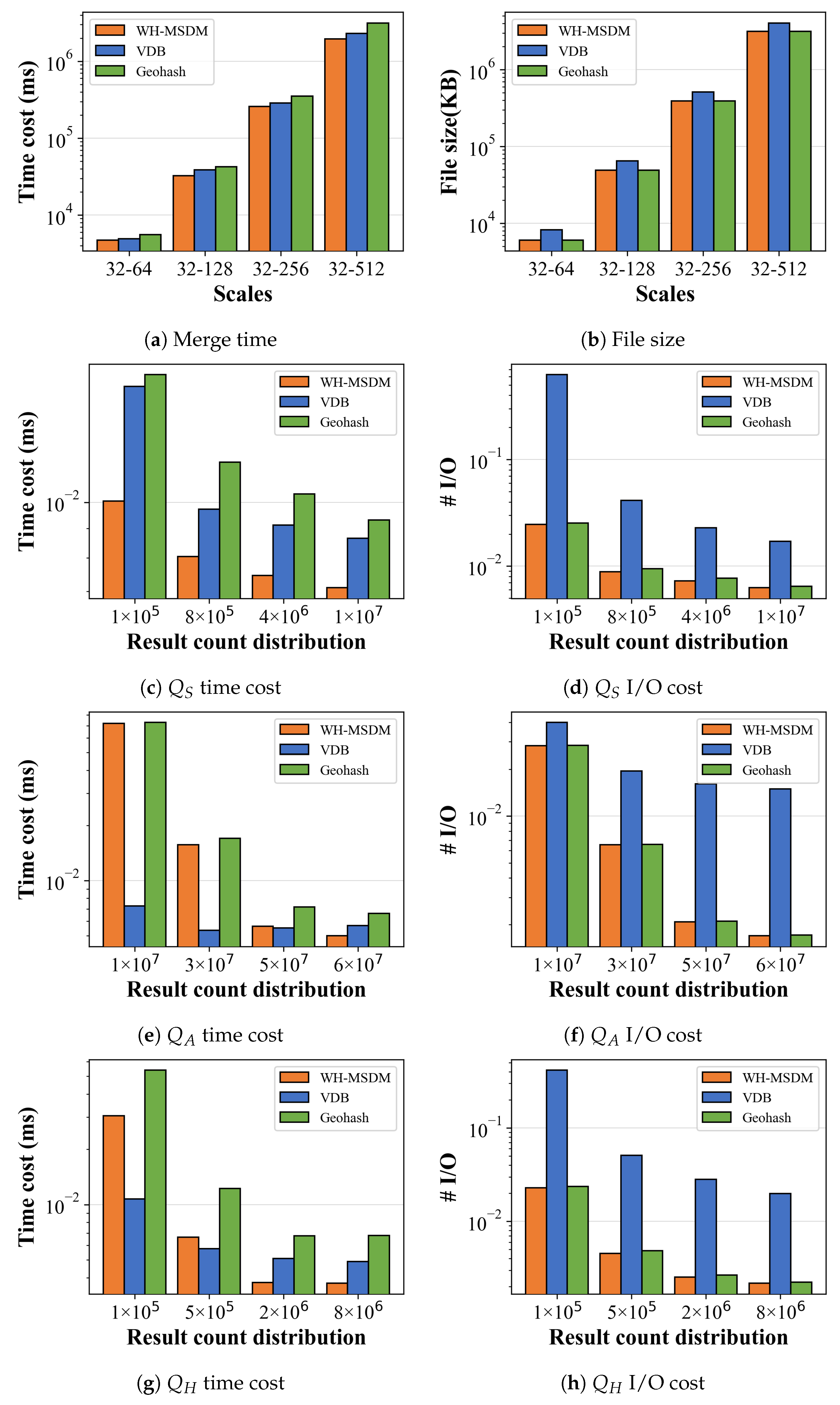On the query side, WH-MSDM provides dedicated procedures for spatial, attribute, hybrid, and cross-scale queries, which together support flexible access to multiscale and multidimensional geological attributes. Benchmark experiments consistently show lower query times and I/O costs compared to the baseline. For spatial queries, WH-MSDM is 24.9% faster than VDB and 32.1% faster than Geohash, while substantially reducing I/O overhead. As data size, attribute count, and maximum scale level increase, WH-MSDM maintains stable performance, whereas VDB and Octree exhibit clear degradation. By exploiting the BMM for efficient cross-scale mapping, the framework quickly and accurately retrieves parent and child blocks, thereby supporting seamless integration across levels of detail in multiscale analysis. The main contributions of this work can be summarized as follows: (1) a W-Hilbert-based unified data structure that assigns contiguous codes to blocks at all resolutions, enabling single-pass retrieval without redundant storage. (2) A bidirectional mapping model that dynamically links three-dimensional geological block coordinates to multiscale storage positions, supporting unified hierarchical indexing and efficient joint querying of geometric structure and multiscale attributes. (3) A suite of query algorithms for spatial, attribute, hybrid, and cross-scale access that improves the flexibility, precision, and efficiency of block data storage and retrieval in complex geological settings.