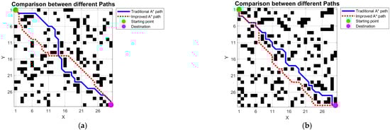 The comparisons of simulation results under different obstacle rates are shown in Figure 5. The comparisons of simulation experimental data between traditional A* algorithm and improved A* algorithm are shown in Table 2. Based on Figure 5 and Table 2, the improved A* algorithm appears to perform more consistently than the conventional approach across the range of obstacle rates tested. The simulation results of multiple experiments all indicate that the improved algorithm can continuously generate smoother paths with fewer turns. As shown in Figure 5, in environments with different obstacle rates, the improved algorithm (red path) can effectively avoid unnecessary jagged turns compared to the traditional A* algorithm (blue path), and its superior path quality is consistently demonstrated across different maps.