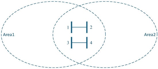 Overlapping partition of Area 1 and Area 2. (Numbers 1–4 denote the power system nodes located in the overlapping region between Areas 1 and 2.).