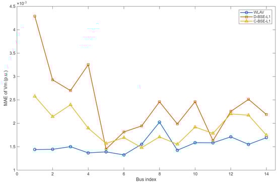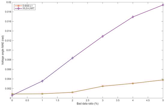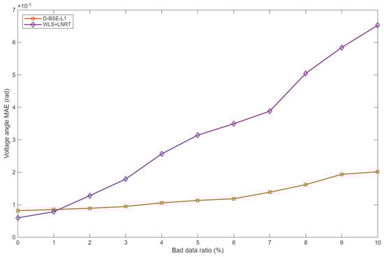 As either the contamination ratio or the outlier magnitude increases, D-BSE-L1 gradually becomes clearly superior. Once the bad-data ratio reaches about 4% at 1.5× or 1% at 5×, D-BSE-L1 already achieves smaller MAEs for both voltage magnitudes and angles. With 10% bad data at 1.5×, the voltage magnitude and voltage angle MAEs of D-BSE-L1 are about 62% and 54% of those of WLS + LNRT, respectively; with 5% bad data at 5×, the corresponding ratios further drop to approximately 43% and 51%. Over the tested range, the MAE curves in Figure 5, Figure 6, Figure 7 and Figure 8 diverge monotonically as the contamination level becomes more severe, confirming that the proposed estimator exhibits a much slower degradation of accuracy.