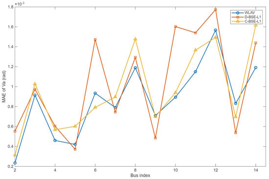 To evaluate the estimator’s performance, the Mean Absolute Error (MAE) of the state vectors and is used to measure estimation accuracy, and the CPU computational time is used to measure computational efficiency. Assume the power system consists of N buses. The true value of its state vector is and the estimated value obtained by the algorithm is .