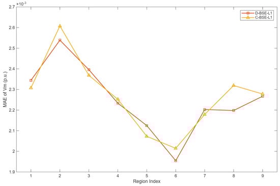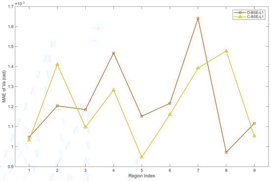 Figure 9 and Figure 10 summarize the area-wise estimation accuracies. For all regions, the MAEs of the voltage magnitude and angle produced by D-BSE-L1 and C-BSE-L1 are very close, indicating that distributing the computation over multiple areas does not noticeably degrade estimation quality, even in the presence of injected bad data. Thus, the proposed coordination scheme preserves the accuracy of the centralized bilinear formulation on this thousand-bus-scale system.