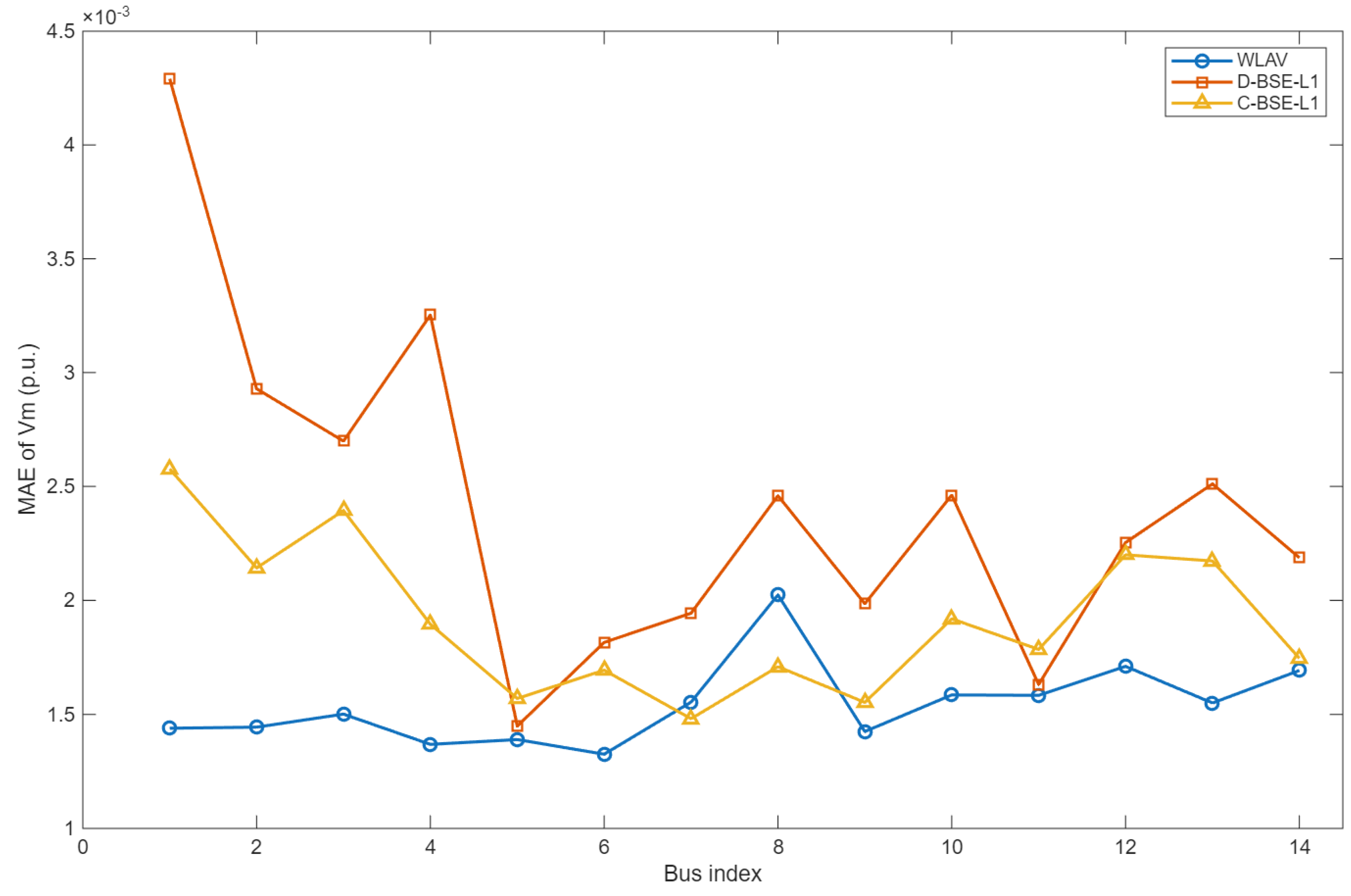 Table 2 indicate that, in the IEEE 14-bus case, the three methods yield estimation errors of the same order of magnitude, with closely matched error magnitudes at the majority of buses. Moreover, the L1-based estimators maintain competitive accuracy under Gaussian noise. Relative to C-BSE-L1, the proposed D-BSE-L1 exhibits close agreement in both estimation trajectories and error profiles across buses, suggesting that the distributed solution reproduces the statistical performance of the centralized method without a material loss in accuracy. In addition, a side-by-side comparison between the bilinear-model results and those of the nonlinear WLAV benchmark shows similar overall MAEs, indicating that the bilinear approximation does not materially amplify modeling bias in this setting.