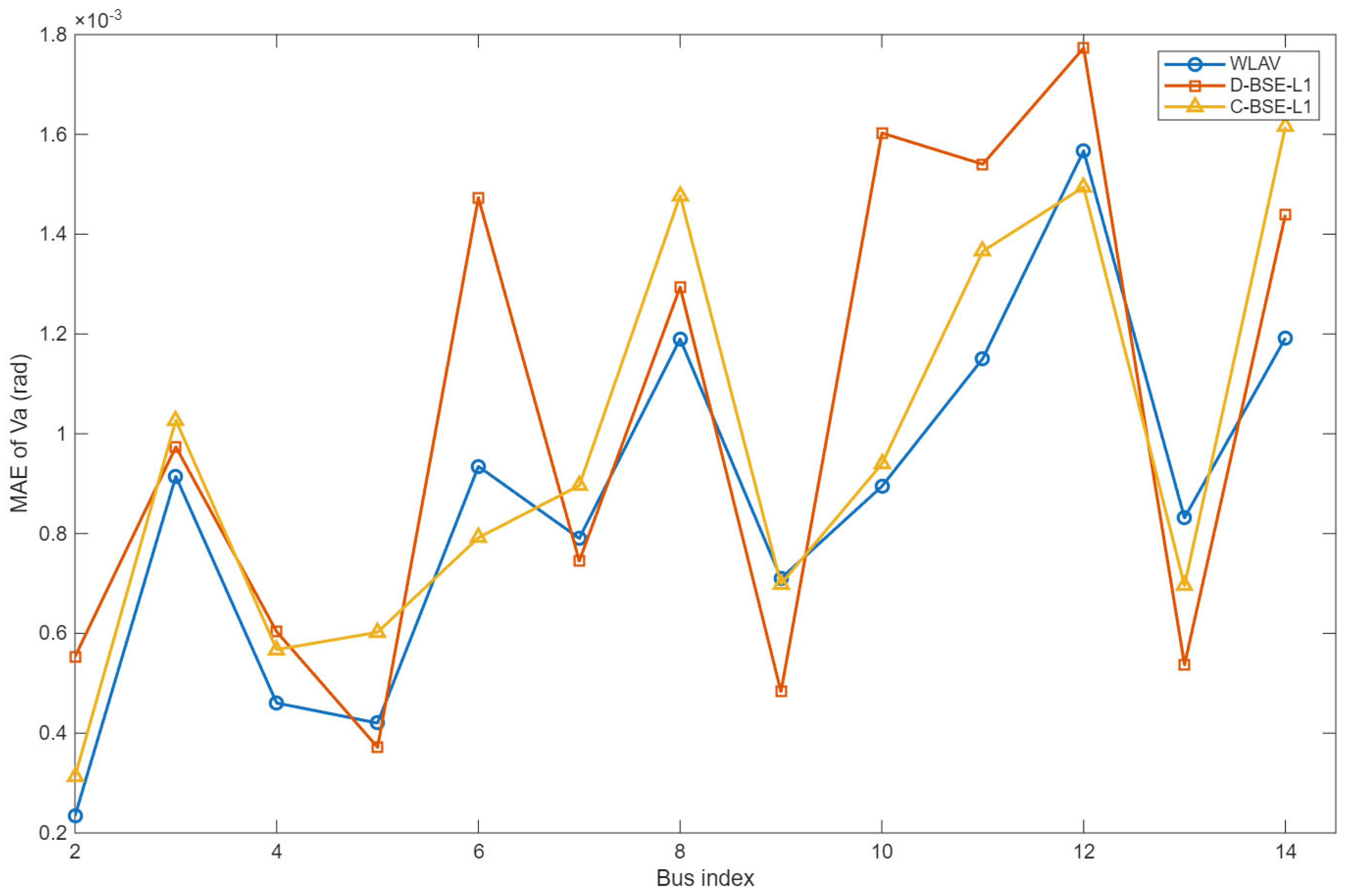 To assess the effectiveness and reliability of the proposed distributed bilinear state estimator with L1 loss (D-BSE-L1) presented in Algorithm 1, we compare it against two baselines: (i) its centralized counterpart under the same bilinear model (C-BSE-L1) and (ii) the classical WLAV estimator under the nonlinear AC measurement model. The comparison is designed to examine (a) whether the bilinear approximation introduces material modeling error relative to the nonlinear model and (b) whether the distributed scheme can match the estimation accuracy of the centralized counterpart.