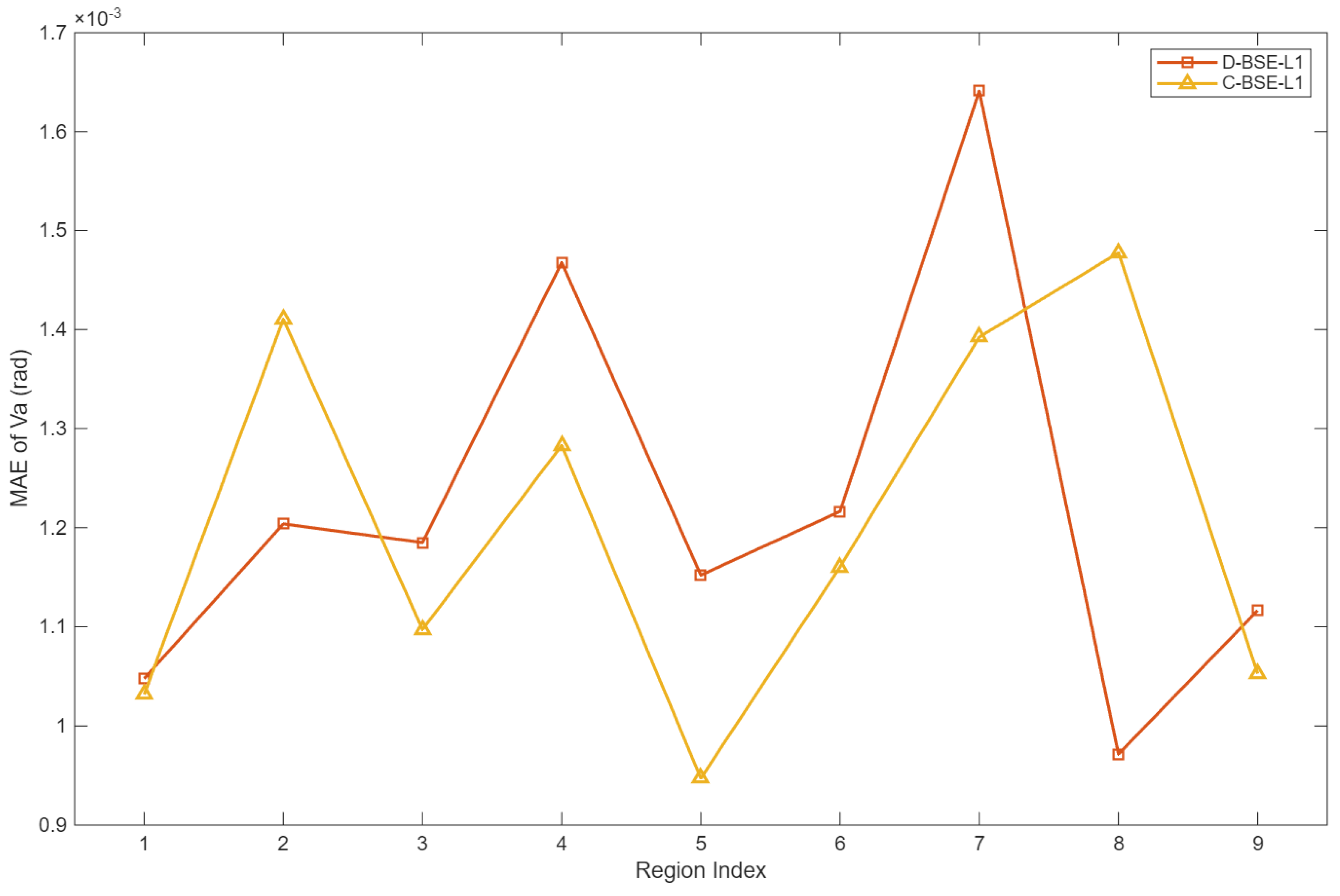 Figure 10 summarize the area-wise estimation accuracies. For all regions, the MAEs of the voltage magnitude and angle produced by D-BSE-L1 and C-BSE-L1 are very close, indicating that distributing the computation over multiple areas does not noticeably degrade estimation quality, even in the presence of injected bad data. Thus, the proposed coordination scheme preserves the accuracy of the centralized bilinear formulation on this thousand-bus-scale system.