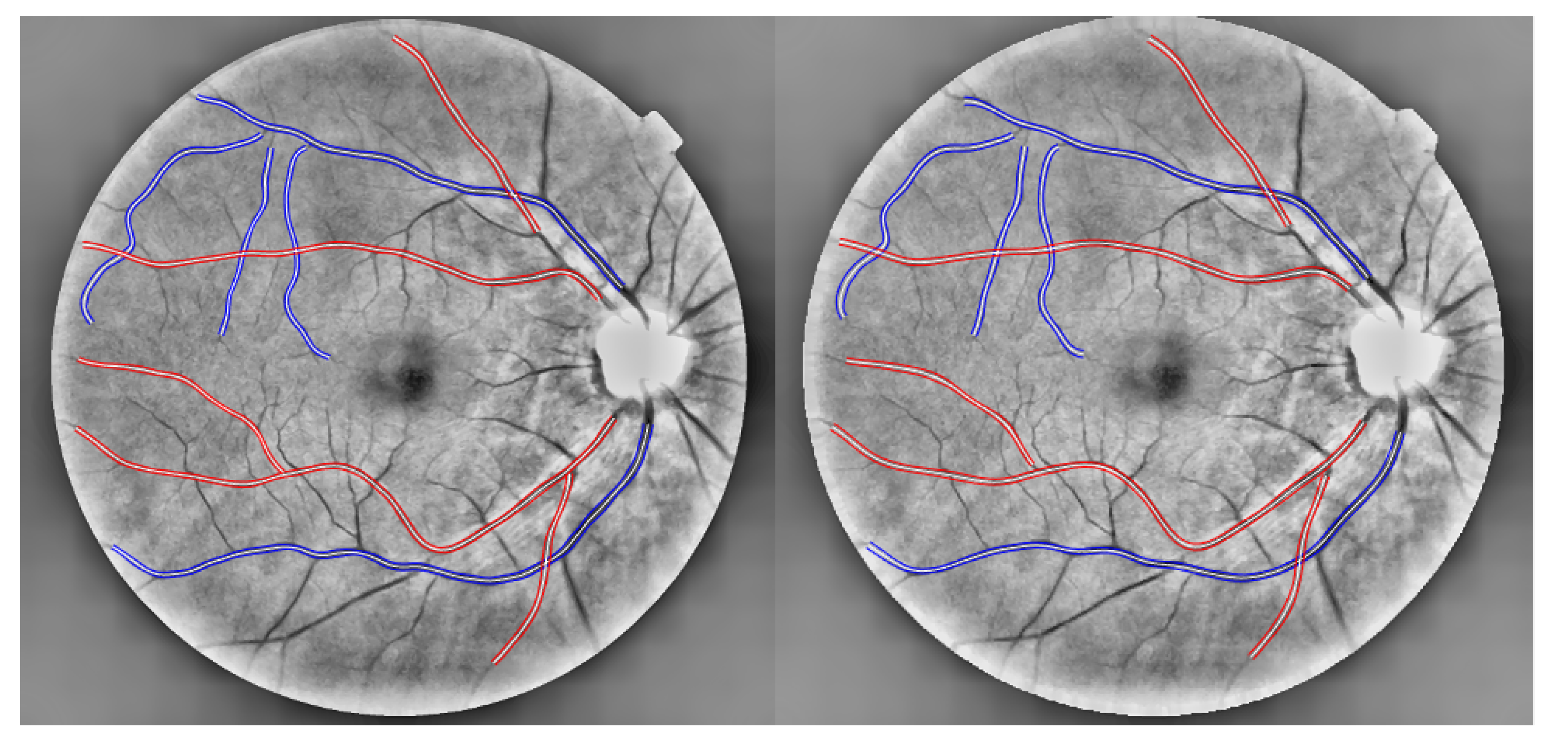 - Segment retinal blood vessels, select segments of similar length and caliber, and order vessels by increasing tortuosity or adopt an existing dataset (as in Section 2.3)