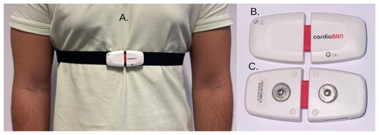 Illustration of the CardioBAN wearable Device (PLUX Biosignals, Lisbon, Portugal). (A) Device positioned on the chest using the elastic strap. (B) Frontal view of the device. (C) Rear view of the device, highlighting the snap connectors for attachment to the chest strap.