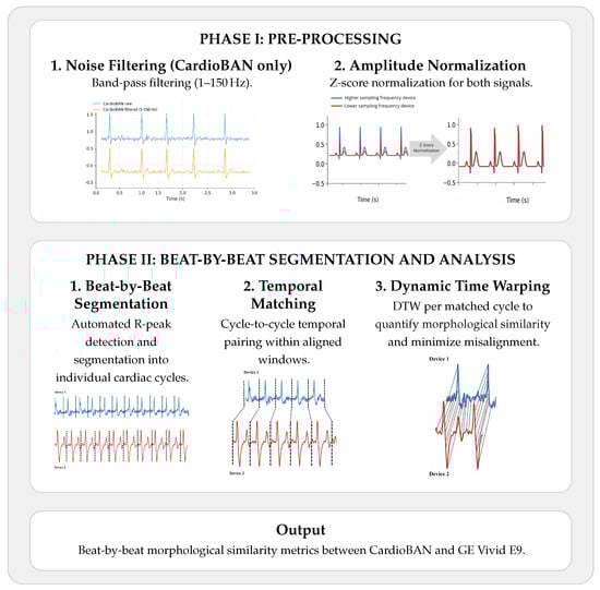 The ECG signals obtained from the wearable device (CardioBAN) and the clinical reference system (GE Vivid E9) were recorded simultaneously in a controlled environment to ensure temporal correspondence between both sources. A two-phase processing pipeline was applied to all recordings to minimise noise, harmonise signal characteristics, and enable waveform-level comparison between devices, as illustrated in Figure 2.