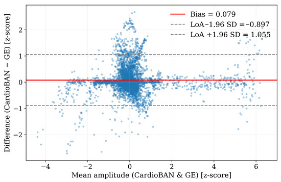 These findings were corroborated by the Bland–Altman analysis (Figure 5). The systematic bias was minimal (0.079), indicating an absence of consistent over- or underestimation between devices. The 95% limits of agreement (−0.897 to 1.055) were narrow relative to the dynamic range of the z-score–normalised ECG signals, reflecting small point-wise amplitude differences across the dataset. The dense concentration of points around the mean bias further shows that, once temporal misalignment is corrected by DTW, the CardioBAN wearable provides amplitude measurements that closely match those of the clinical GE Vivid reference.