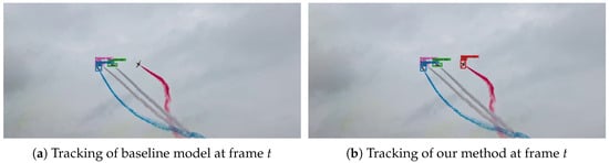 To visually demonstrate the improvement, the proposed method was tested on untrained video data and target categories, compared with the baseline model. Different bounding box colors represent different targets. At frame t Figure 8, the baseline model detects three performing fighter jets, missing one. The fighter jet detected by the blue bounding box is climbing rapidly and is about to be occluded by the fighter jet detected by the pink bounding box. The proposed model detects all four performing fighter jets at frame t. At frame Figure 9, the baseline model, using a pure appearance strategy for target association, misidentifies the fighter jet represented by the blue box at frame t as the fighter jet from the pink box at frame t, resulting in an incorrect ID assignment. Meanwhile, the pink fighter jet from frame t is considered a new appearance and is represented by a red bounding box at frame . In contrast, the proposed model, utilizing the multi-cue fusion target association strategy, maintains the ID assignment (blue box) for the rapidly climbing fighter jet from frame t even after occlusion with the pink-box fighter jet at frame . The ID of the fighter jet represented by the pink box at frame also remains consistent with frame t. There is no ID switch due to deformation and occlusion before and after the event, demonstrating that the multi-cue fusion strategy has a certain effect on mitigating occlusion and deformation.