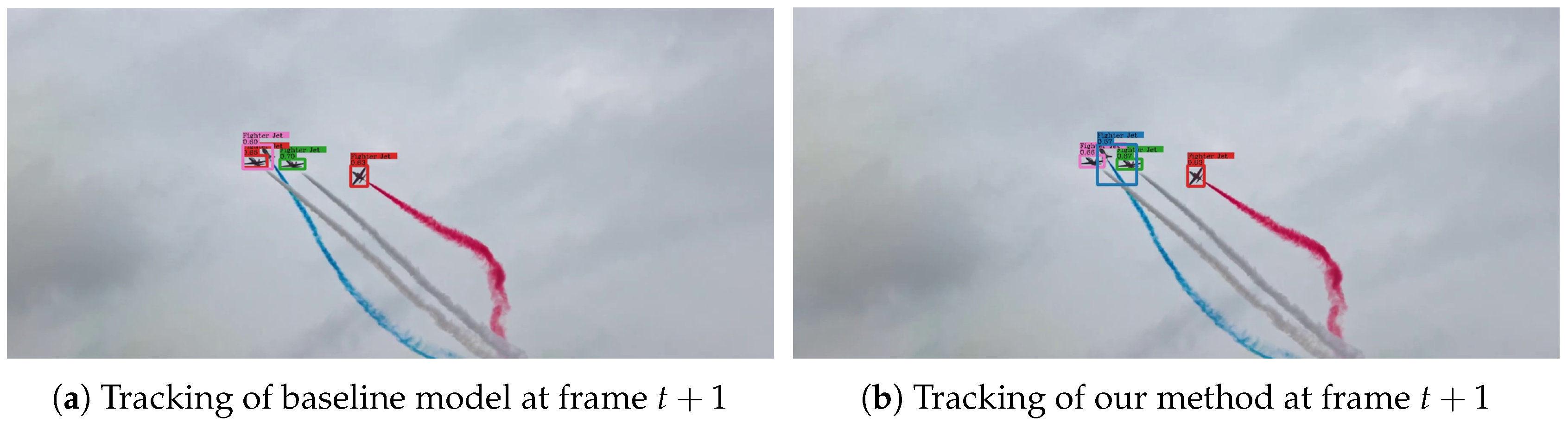 t Figure 8, the baseline model detects three performing fighter jets, missing one. The fighter jet detected by the blue bounding box is climbing rapidly and is about to be occluded by the fighter jet detected by the pink bounding box. The proposed model detects all four performing fighter jets at frame