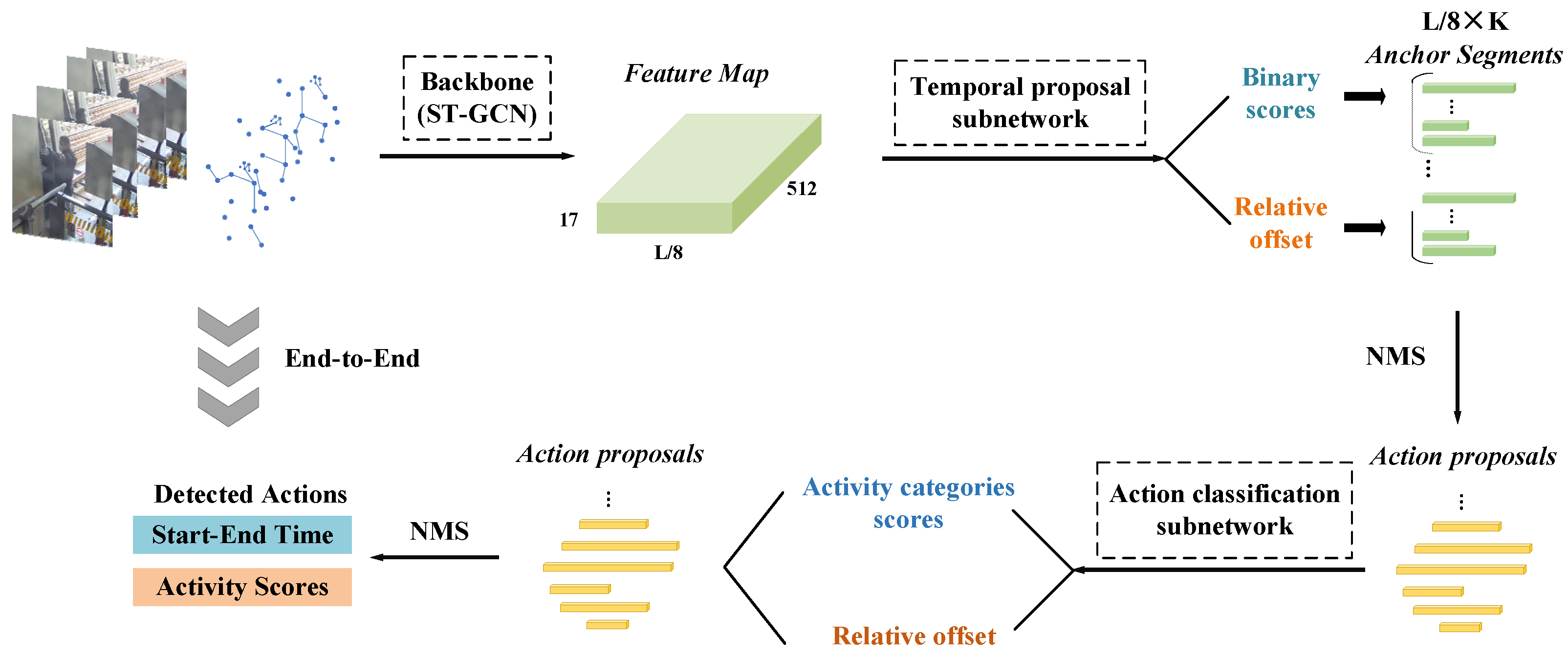 - An end-to-end detection framework adapted from R-C3D network is developed for skeleton data. The feature propagation layers are distinctly redesigned for classification and boundary regression, enabling the models to focus on task-relevant information and achieve efficient end-to-end detection with improved deployment feasibility.