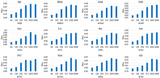 The Dice scores for some small-volume or structurally complex organs, such as the stomach (Sto) and adrenal glands (AG), start to decrease when the feature space dimension reaches 2048. This phenomenon can be attributed to the overfitting risk associated with excessive network capacity. On the one hand, the larger feature space is more likely to memorize noise or redundant local patterns from the training data because these organs have intrinsically complex anatomical structures or hazy boundaries with neighboring tissues. On the other hand, when trained on a small dataset, the increased dimensionality makes optimization more difficult and results in inadequate generalization, which ultimately leads to local structural misidentifications and lowers the segmentation accuracy on the test set.