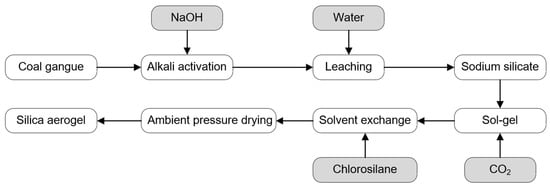 Coal gangue (CG), a solid waste generated during coal mining, washing, and processing, usually constitutes 10–15% of the total raw coal output [9]. It has been reported that the stockpile in China exceeded 5 billion tons and grew by 350 million tons annually [10,11]. An endless stream of CG will be associated with coal usage as an indispensable energy source for a long time, impacting environmental safety and human health. In terms of minerals, CG primarily consists of carbonaceous shale, clay minerals, sandstone, and residual coal [12,13]. In terms of elements, CG mainly contains silicon, aluminum, and small amounts of calcium, iron, and magnesium, and also includes sulfides and heavy metals (e.g., lead, cadmium, mercury) [14,15,16]. Characterized by high ash content, low calorific value, and a dense structure, coal gangue accumulates in large quantities, leading to land occupation, soil salinization, water contamination, airborne dust, and hazards related to spontaneous combustion [17,18,19]. These issues threaten ecosystems and human health, particularly in mining-intensive regions. Currently, CG recycling is applied in many ways, such as adsorbent materials for environmental remediation, lightweight aggregates for concrete, water retention and slow-release fertilizers for agricultural production, as well as the recycling and extraction of valuable elements [20,21,22,23,24]. However, the recycling of CG faces significant challenges, including its heterogeneous composition, low chemical reactivity, and high processing costs, which often drive reliance on low-cost but environmentally detrimental practices such as landfills. Consequently, the accumulation of CG waste continues to rise, with secondary pollution risks (e.g., heavy metal leaching, dust emissions) persisting during processing. To address these issues, transforming CG into high-value products is critical to enhancing recycling efficiency, reducing environmental impacts, and fostering sustainable resource utilization. To address the focused challenge of recycling, producing a high-value product such as SiO2 aerogel from CG is clearly an innovative approach.