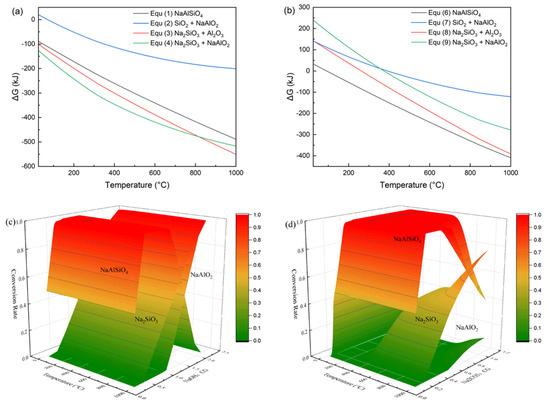 The Gibbs free energy of the kaolinite reaction with NaOH (a) and Na2CO3 (b), and the equilibrium conversion of the simplified CG composition activation products under NaOH (c) and Na2CO3 (d).