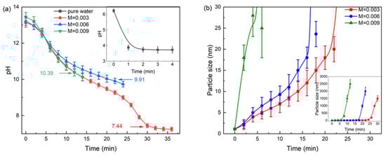 Particle growth dynamics further revealed concentration-dependent behavior, as shown in Figure 6b. In solutions with molar ratios of 0.006 and 0.003, the particle size increased in an approximately linear manner, followed by a rapid acceleration just before the gelation point. In contrast, in the more concentrated solution (0.009), the particle size increased rapidly to 28 nm within 4 min, after which rapid gelation occurred. These phenomena can be explained by the coupling of silicate polymerization kinetics and physical mass-transfer limitations. At the 0.006 ratio, the concentration supported steady progression of silicic acid polymerization. This process consumes protons, creating a pronounced chemical buffering effect that effectively retards the pH decrease. In the dilute solution (0.003), the limited availability of silicate ions resulted mainly in monomer formation with minimal polymerization, leading to pH behavior dominated by acid-base equilibrium. The concentrated solution (0.009) exhibited a more complex two-stage mechanism: the initial rapid pH drop was likely caused by an intense, localized polymerization event that consumed protons vigorously. Subsequently, the sharp rise in viscosity from rapid oligomerization imposed severe mass-transfer limitations, hindering CO2 diffusion and shifting the rate-determining step from chemical reaction to physical diffusion. This accounts for the similar mid-term pH trend observed in the dilution-limited 0.003 system. The markedly shorter gelation time of the 0.009 solution stems directly from its high initial concentration, which promotes the rapid formation of a system-spanning silica network.