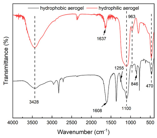 Silica aerogel was successfully prepared via sol–gel process induced by CO2 carbonation, followed by ambient pressure drying (APD). The reactions involved in the hydrophobic modification of the silica gel surface are presented in Equations (15)–(20). The FT-IR spectrum of the hydrophobically modified gel is shown in Figure 7. The absorption peak at 3428 cm−1 corresponds to the stretching vibrations of Si–OH and adsorbed water [35]. Furthermore, the intramolecular stretching vibration of the Si-OH group occurs at approximately 963 cm−1 [36]. In hydrophilic aerogels, the abundant Si–OH groups on the SiO2 surface form strong hydrogen bonds with each other or with adsorbed water molecules. This results in an energy level shift in the H–O–H bending vibration, causing a blue shift and appearing at 1637 cm−1 [37]. In contrast, in hydrophobic aerogels, most Si–OH groups are replaced by Si–CH3. The remaining Si–OH groups are isolated by surrounding methyl groups, reducing water adsorption and hydrogen bonding. As a result, the bending vibration exhibits a red shift, observed at 1608 cm−1. The peak at 1255 cm−1 is attributed to the symmetric bending vibration of Si–CH3, and the absorption at 846 cm−1 corresponds to the stretching vibration of Si–C [38]. These peaks confirm the successful modification of the aerogel with the silane agent. Finally, the broad band around 1100 cm−1 is assigned to the asymmetric stretching vibration of Si–O–Si [39], while the peak at 470 cm−1 arises from the bending vibration of Si–O–Si [40]. Both signals indicate the presence of a typical silica network structure.