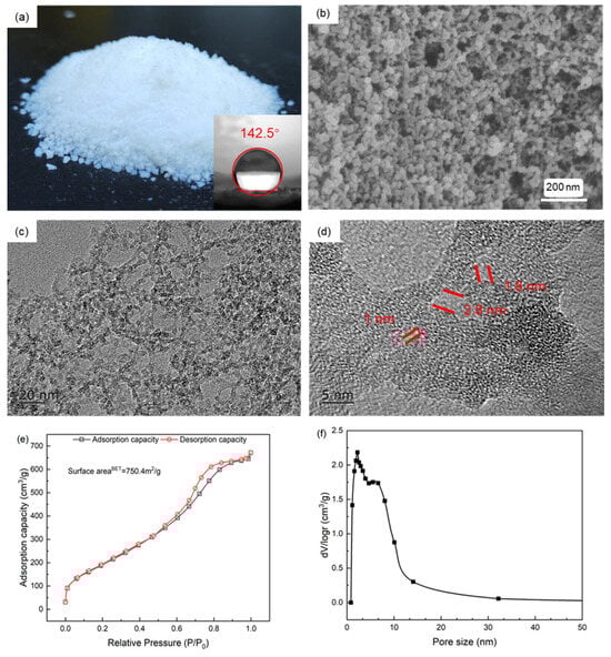 Digital photos and water contact angle (a), SEM image (b), TEM images (c,d), nitrogen adsorption and desorption isotherm (e), and pore size distribution (f) of SiO2 aerogel.