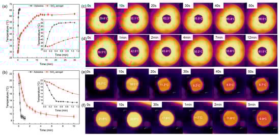 Low and high management performance of aerogel versus asbestos: (a,b) temperature evolution over time on an open heat source and cold source, respectively; (c,d) infrared thermal images of asbestos and aerogel on the heat source; (e,f) corresponding infrared thermal images on the cold source.