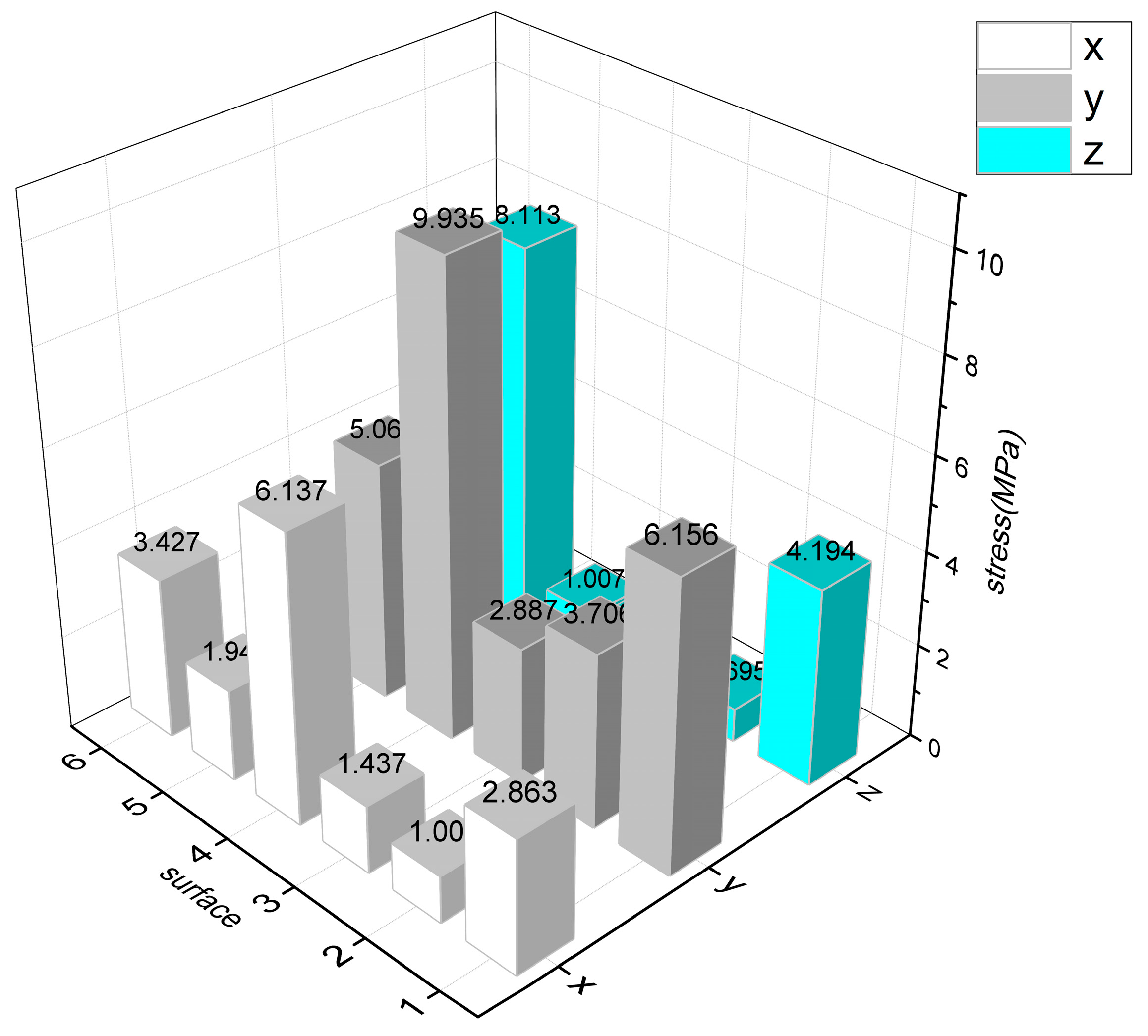 | Direction | Maximal Displacement (×10−6 m) | Maximal Stress (MPa) |