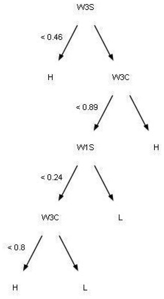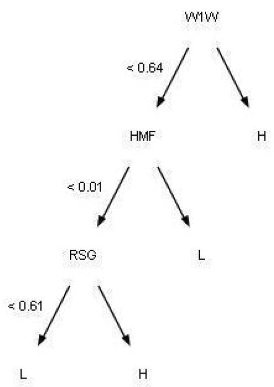 The primary goal of the “root node” is to start with the feature that best separates the LL honeys from the HL honeys. For instance, the most informative parameter based-on the physico-chemical is RSG.