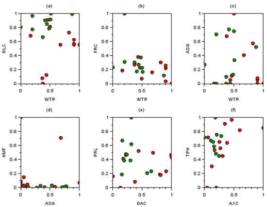 Scatter plots of the physico-chemical features for lowland (red dot; 5–750 m) and highland (green dot; 940–1500 m). Decision Boundaries may not be clearly defined. (a) WTR-GLC; (b) WTR-FRC; (c) WTR-ASG; (d) ASG-HMF; (e) DAC-PRL; (f) AXC-TPH.