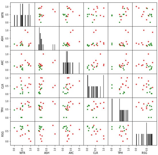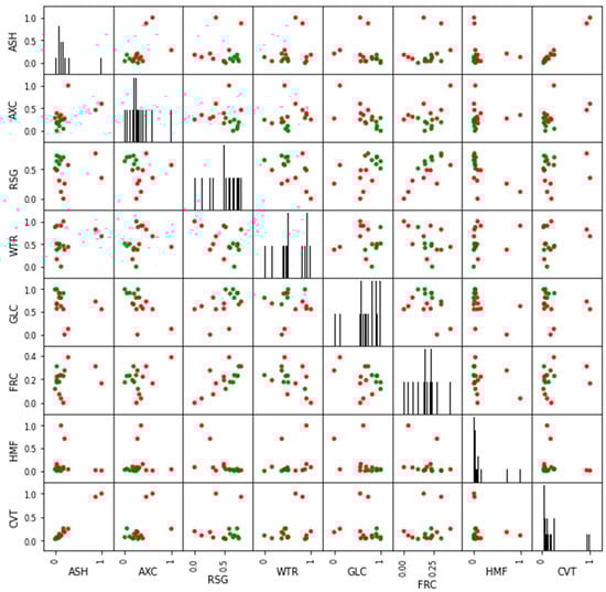 Histograms and scatter plots of hybrid analysis of alternative quality features. Two-zone geographical categories, lowland (red dot; 5–750 m) and highland (green dot; 940–1500 m). There are clear segregated clusters or well-defined decision boundaries between categories (RSG–AXC–ASH), therefore classification by geographical origin is feasible.