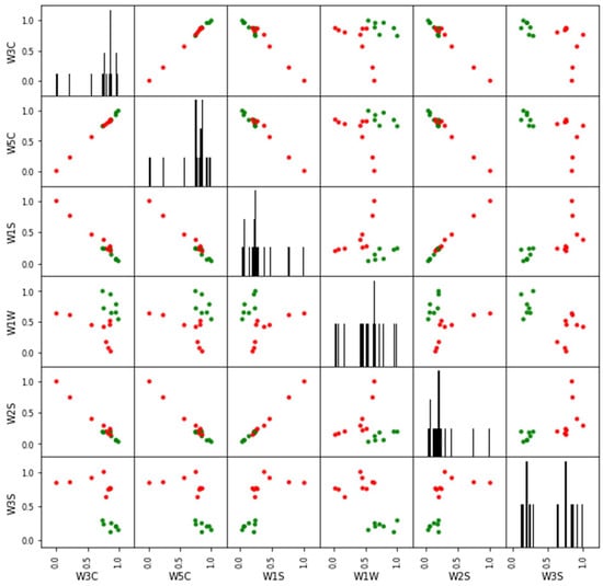Scatter plots of the e-Nose features for lowland (red dot; 5–750 m) and highland (green dot; 940–1500 m). Decision Boundaries may not be clearly defined. (a) W3S–W3C, (b) W1S–W3C, (c) W1W–W1S, (d) W2S–W1W, (e) W3S–W2S, (f) W3C–W3S.