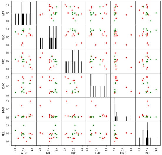Histograms and scatter plots of hybrid analysis of quality related features. Two-zone geographical categories, lowland (red dot; 5–750 m) and highland (green dot; 940–1500 m). There are not clear segregated clusters or well-defined decision boundaries between categories, therefore classification by geographical origin is not feasible.
