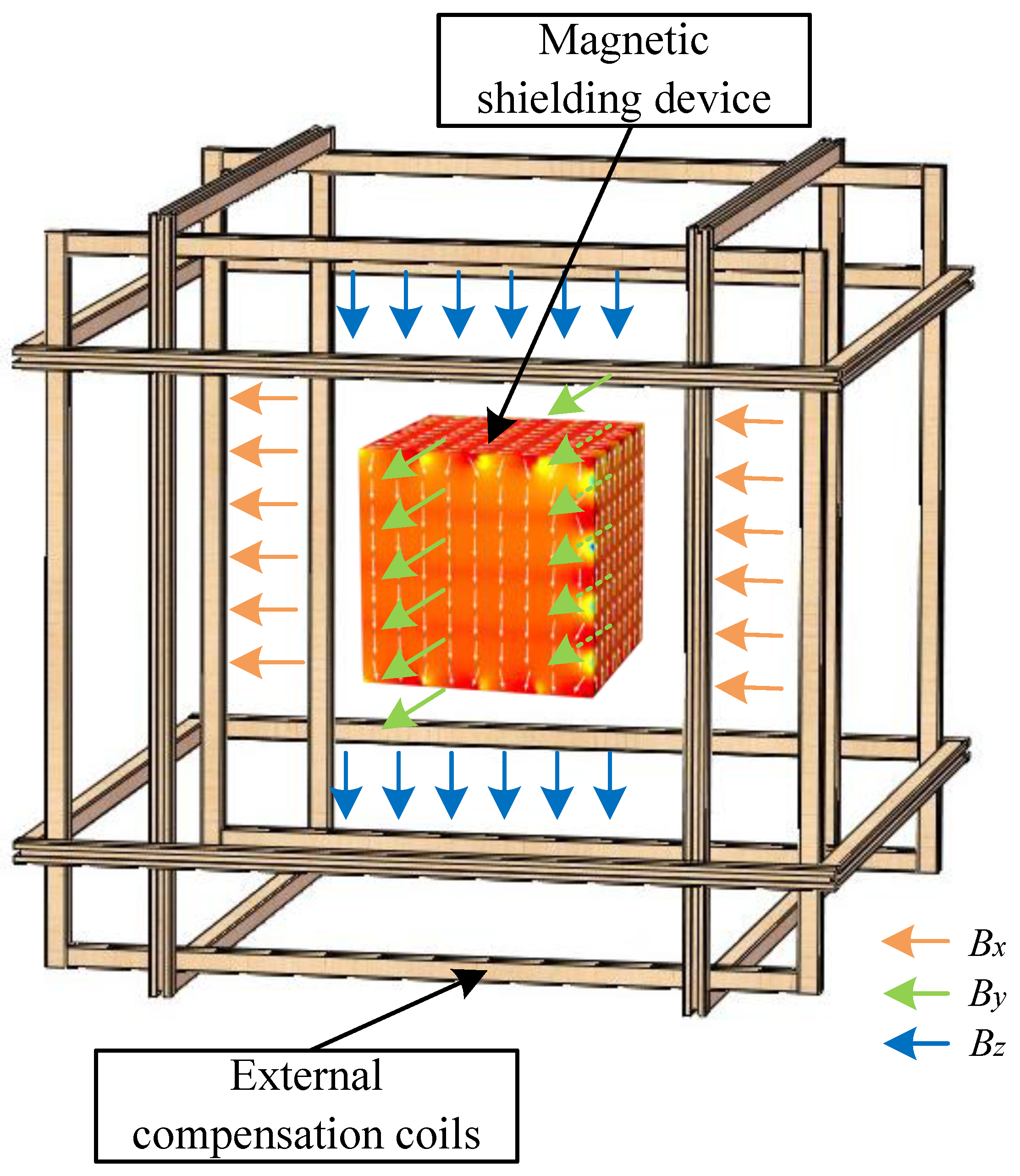- Chen, Y.; Lin, S.; Jin, C.; Dai, X.; Pan, D.; Jin, Y.; Li, Y.; Li, L. Optimization Method for Weak Magnetic Measurement Environments Using Active–Passive Coupled Magnetic Shielding Analysis. IEEE Trans. Instrum. Meas. 2025, 74, 1–11. [Google Scholar] [CrossRef]